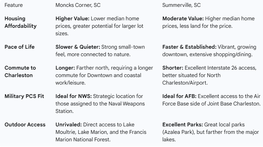 For many of our clients, the decision comes down to Moncks Corner versus Summerville. Both offer suburban living near Charleston, but they appeal to different priorities.